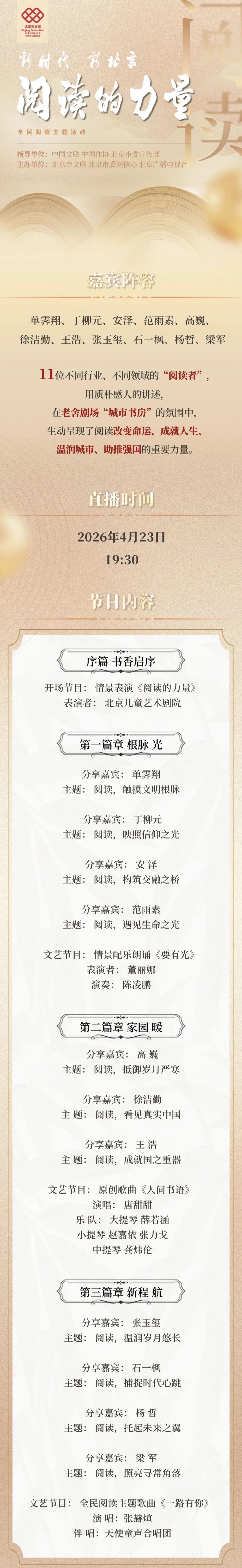 由北京市文联、北京市委网信办、北京广播电视台联合主办的“新时代新北京·阅读的力量”全民阅读主题活动将于4月23日19点30播出。届时,中国艺术报视频号将直播,欢迎预约观看。