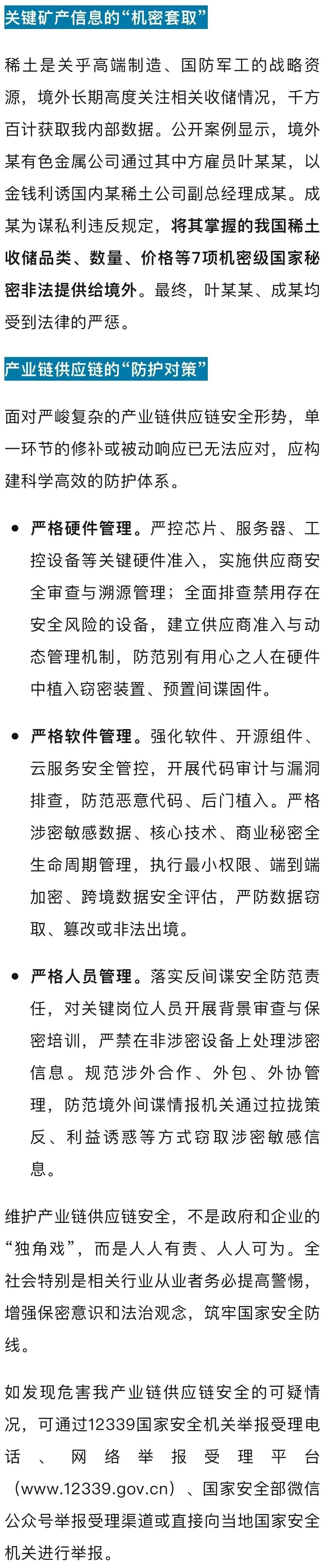 产业链供应链安全事关国家经济安全和高质量发展全局。近年来,境外间谍情报机关针对我国产业链供应链的渗透、破坏与窃密行为日益隐蔽化、专业化、体系化,对我国经济安全、科技安全与数据安全构成严重威胁。