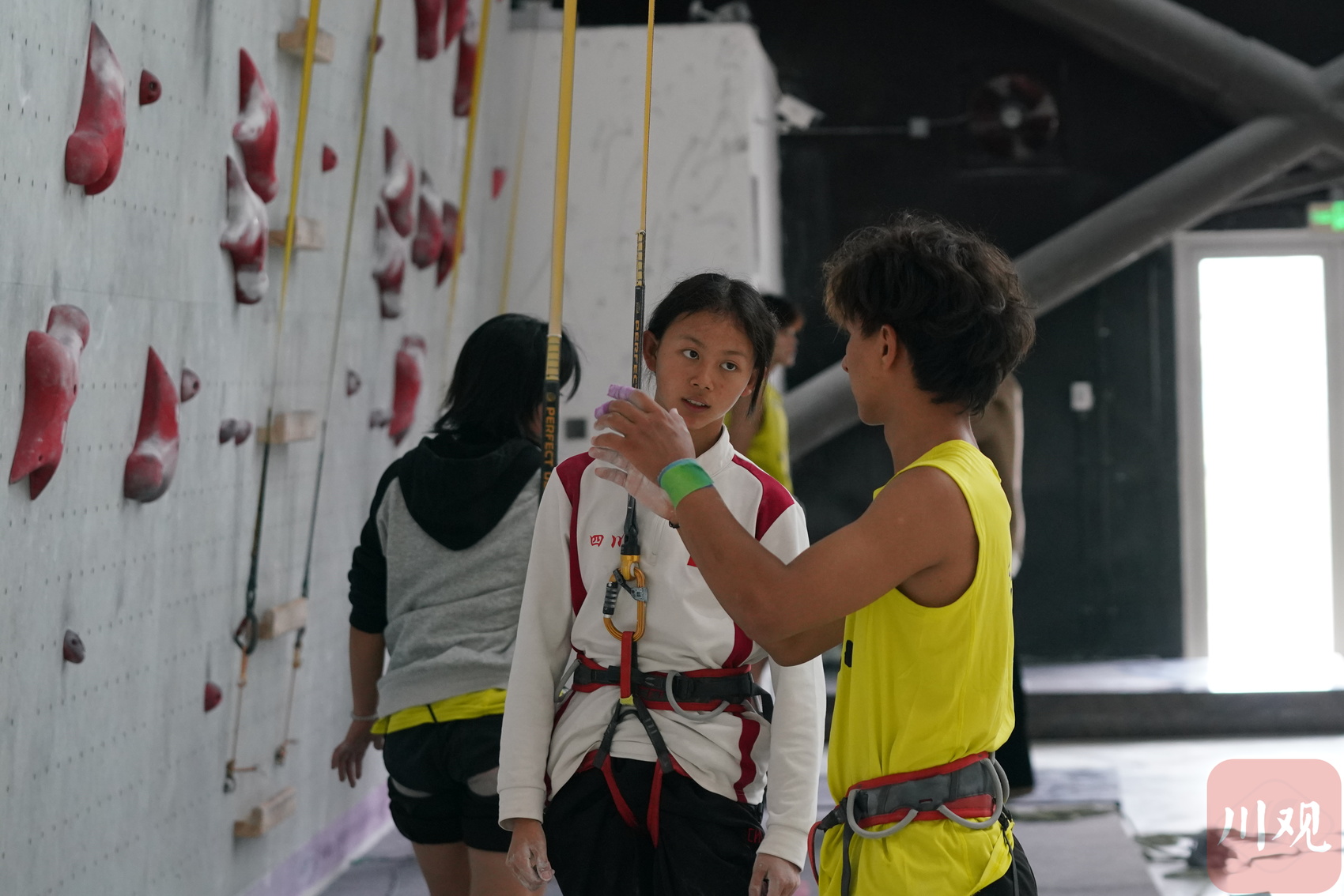 攀岩爱好者在中国·眉山时尚运动中心攀岩馆交流攀岩心得