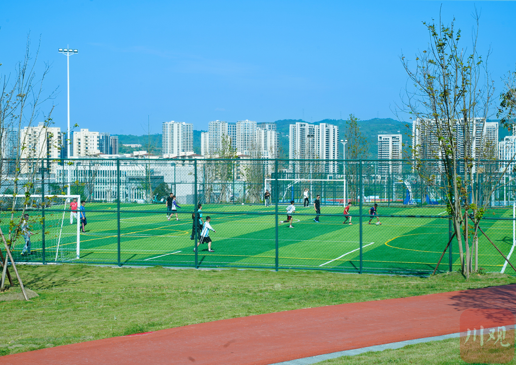 市民在眉山天府新区体育公园足球场开展足球运动
