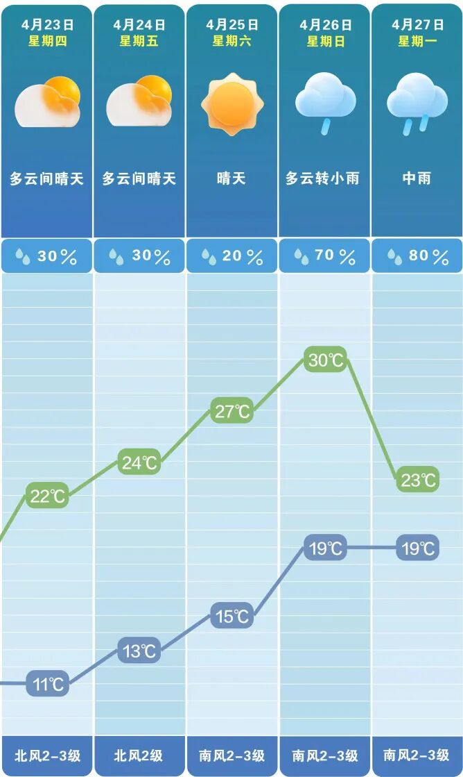 市气象台数据显示,23日长沙多云间晴天,气温上升,11℃至22℃;24日多云间晴天,最高气温上升至24℃;25日长沙晴天,气温继续上升到15℃至27℃;26日多云转小雨,虽然最高气温攀升到30℃,但又要下雨了!27日中雨,最高气温23℃。