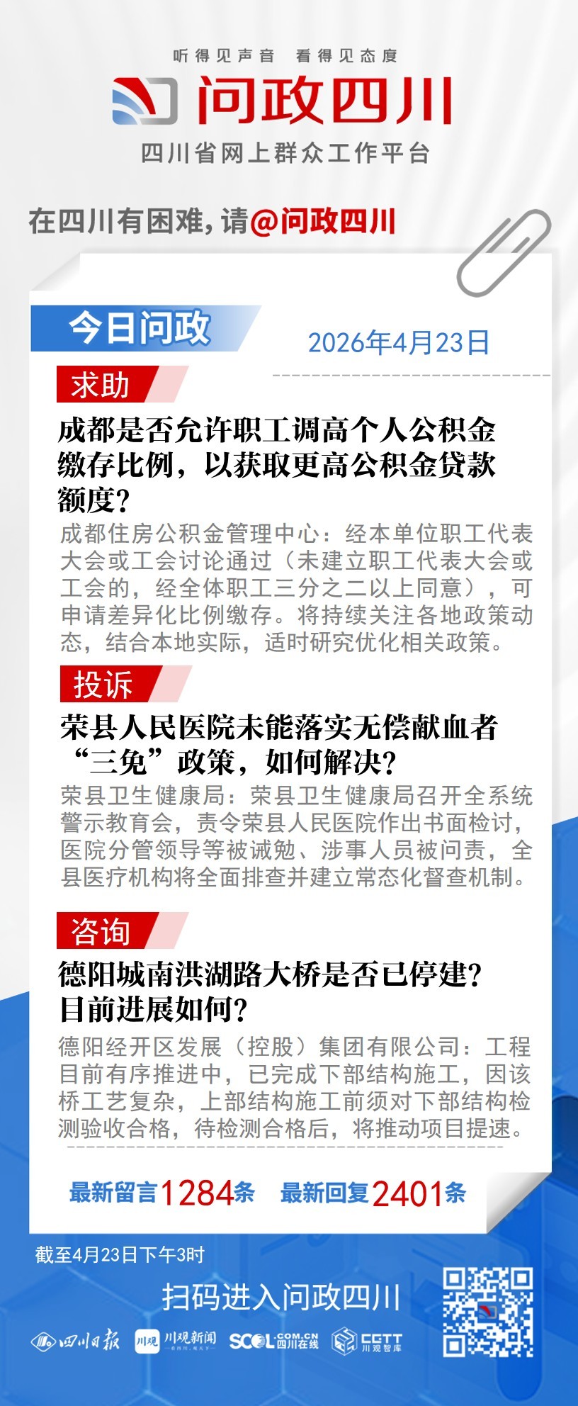 在四川有困难,找问政四川。如果您在四川遇到了操心事、烦心事、揪心事,请登录“四川省网上群众工作平台—问政四川”或拨打问政四川热线(028-96001)留言反映、求助或建议。我们将充分发挥平台的互动联系作用及舆论监督功能,第一时间传递民声,推动问题得以及时解决——听得见声音,看得见态度。