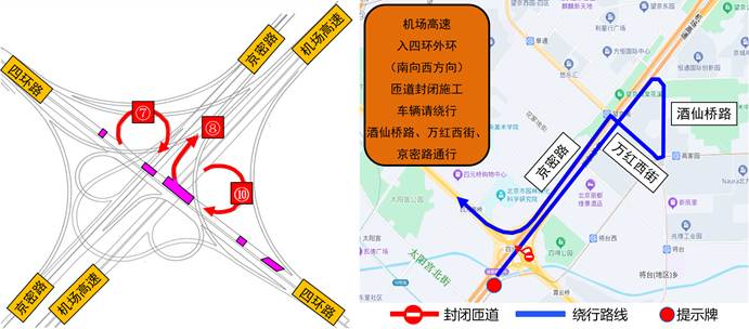 绕行路线:在机场高速出京方向四元桥西设置提示标志,提示车辆沿机场高速向北→酒仙桥路出口驶出→酒仙桥路→万红西街→京密路→四环外环(绕行距离5.1公里)