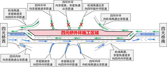 4月25日0时至26日24时,将实施四元立交桥系四环主路外环(逆时针方向)施工,采取“分幅占路、对向导行”保障通行,同步封闭四环外环向京密路进京匝道、四环外环向京密路出京匝道、机场高速出京向四环外环匝道3条关联匝道。