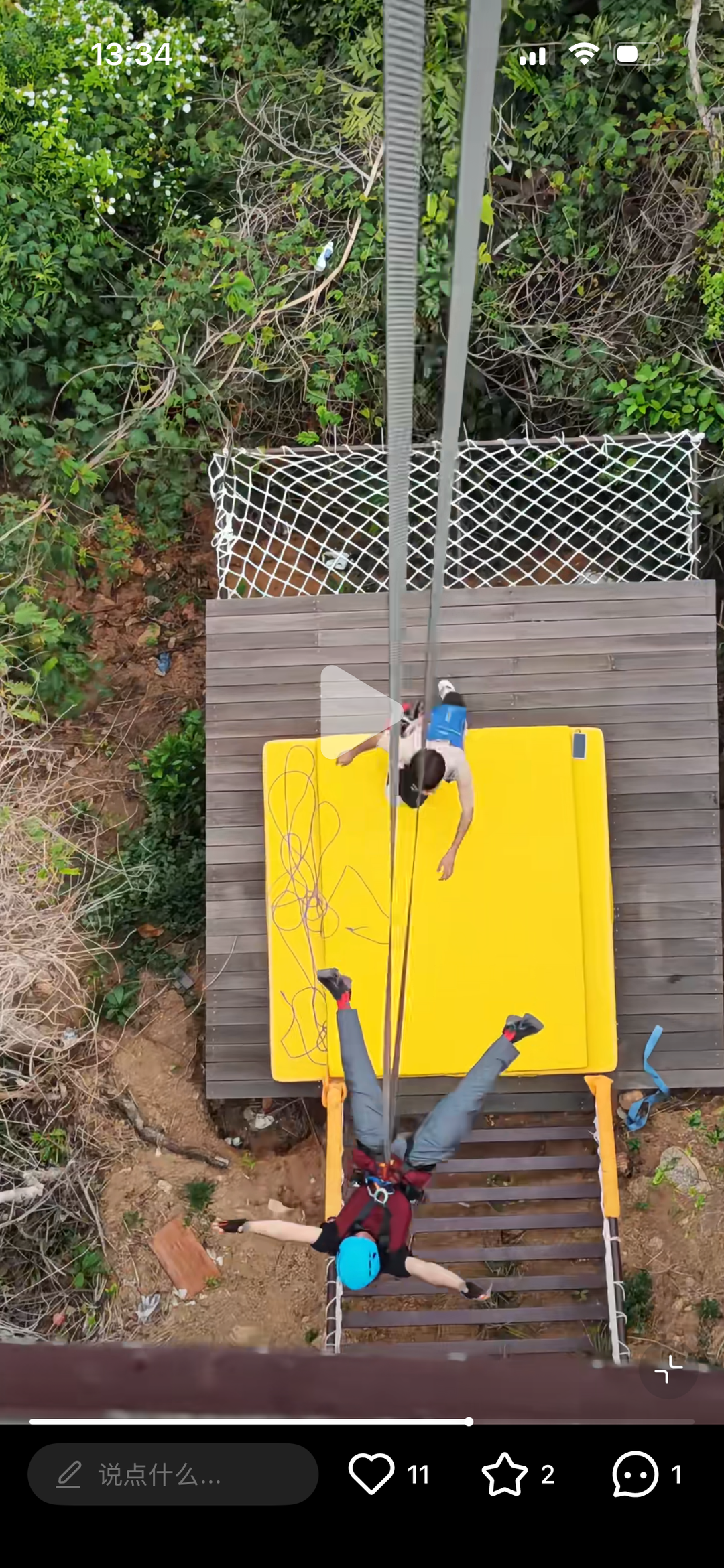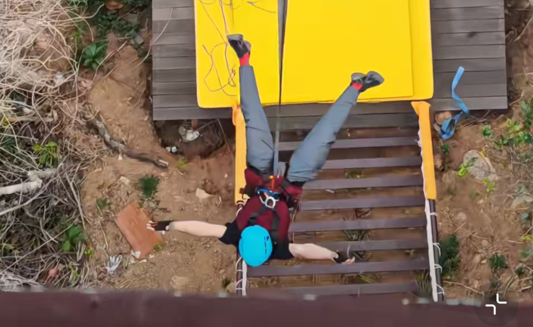 他满心期待地参与,但意外却发生了。王先生提供的视频显示,当时在一处蹦极台的位置,他从高处跳跃向下,但安全绳迅速地滑落,而此时,他张开双臂双腿,下降持续了几秒钟。即将降至地面时,其双腿弯曲接触到保护垫,身体却向后倾斜。工作人员见状,立即去抓安全绳,想将他拉至保护垫上,但最终,王先生还是跌坐在保护垫范围外的铁质楼梯上。