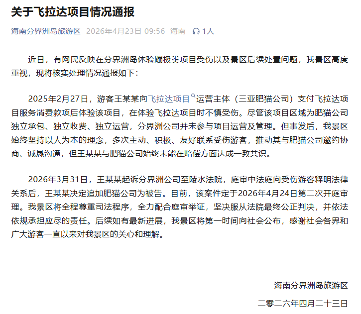 2026年3月31日,王某某起诉分界洲公司至陵水法院。庭审中,法庭向受伤游客释明法律关系后,王某某决定追加三亚肥猫公司为被告。目前,该案件定于2026年4月24日第二次开庭审理。景区在通报中表示:“将全程尊重司法程序,全力配合庭审举证,坚决服从法院最终公正判决,并依法依规承担应尽的责任。”