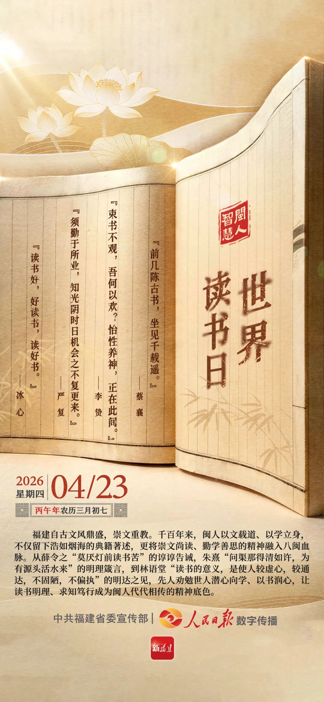 福建自古文风鼎盛,崇文重教。千百年来,闽人以文载道、以学立身,不仅留下浩如烟海的典籍著述,更将崇文尚读、勤学善思的精神融入八闽血脉。从薛令之“莫厌灯前读书苦”的谆谆告诫,朱熹“问渠那得清如许,为有源头活水来”的明理箴言,到林语堂“读书的意义,是使人较虚心,较通达,不固陋,不偏执”的明达之见,先人劝勉世人潜心向学、以书润心,让读书明理、求知笃行成为闽人代代相传的精神底色。