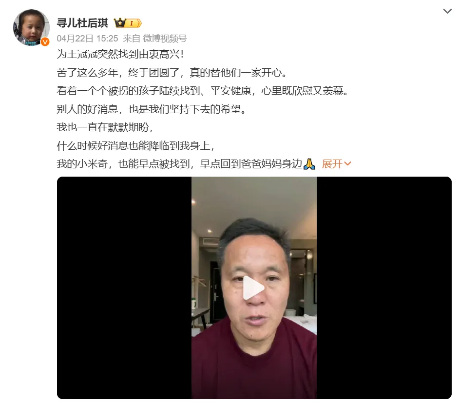 王冠冠找到的消息传来,杜小华、唐蔚华等寻子家长表示祝贺,也希望自己的孩子能早日回家。