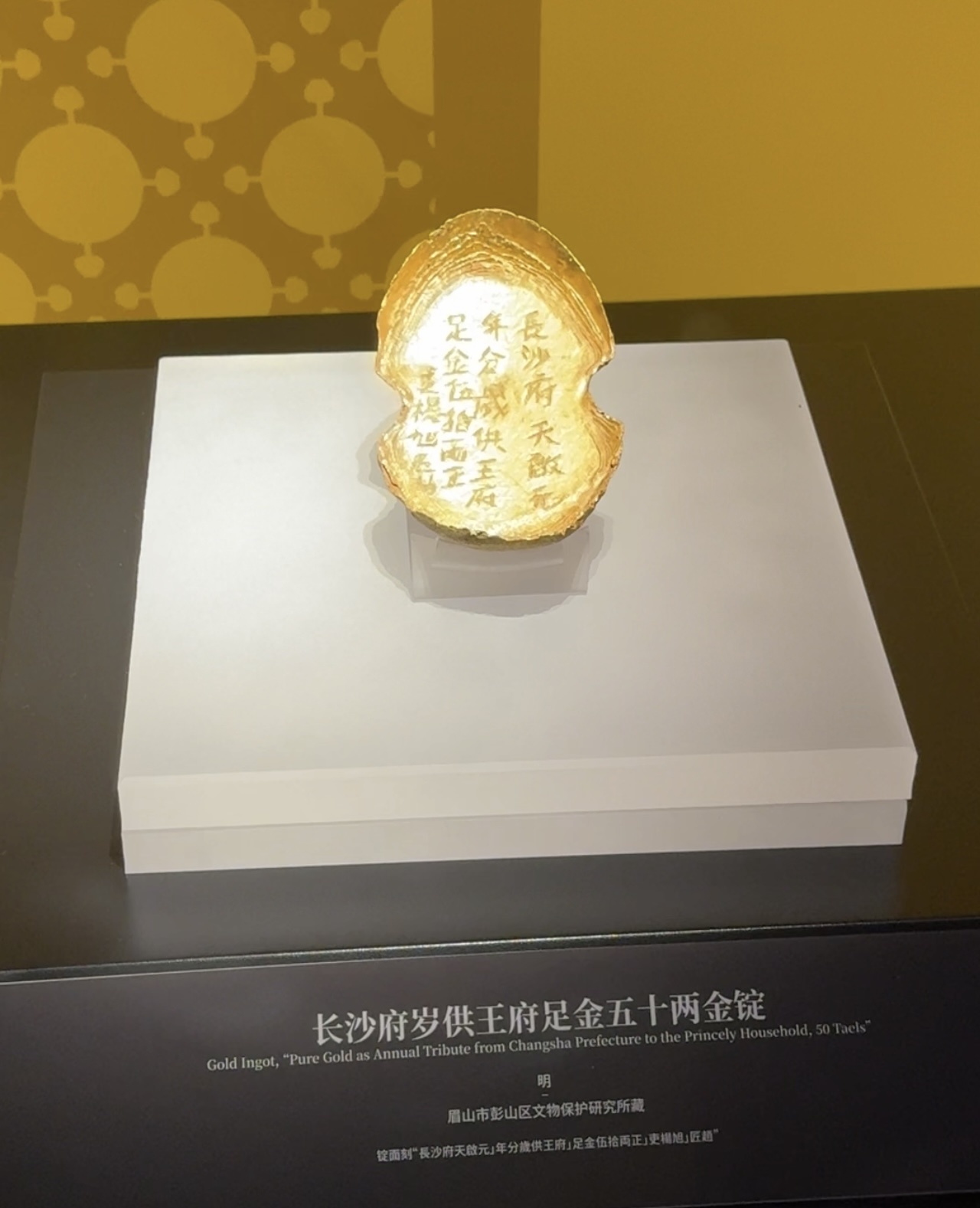 据悉,目前馆藏文物超过7000件,围绕“围堰考古-沉银解谜-白银故事”三大主题展开陈列。采访团的目光很快被一组重磅文物锁定,嘉靖四十五年册封荣王世子朱翊鉁的金册,册文“翊鉁年已长成,特封为荣世子”清晰可辨;重达1805克的长沙府“岁供王府”五十两金锭;还有那块碎裂后又奇迹般拼合完整的“蜀世子宝”金印,每件文物都在无声诉说着那段历史。