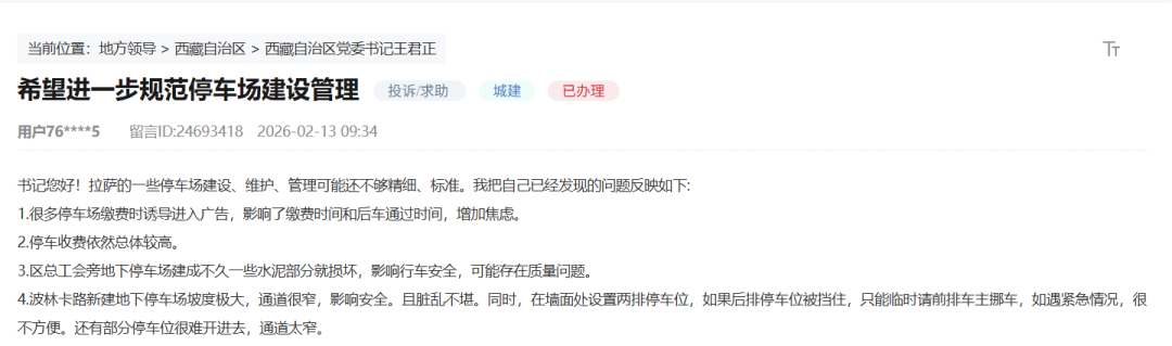 针对网民反映的停车场缴费时存在广告诱导、耽误缴费及通行时间、增加出行焦虑问题,拉萨市城管局第一时间督促属地管理部门开展全面排查整治,严格落实“发现一家、整改一家”的要求。官方回复称,目前已有多家停车场完成整改,后续将持续加大巡查力度,全力保障市民便捷、高效停车。