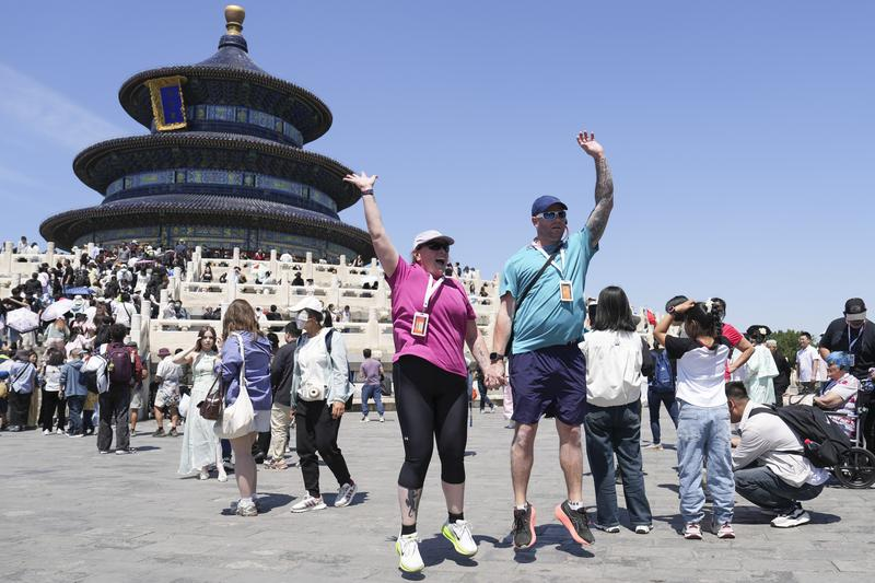 2025年5月1日,来自澳大利亚的游客在北京天坛公园祈年殿前留影。新华社记者 鞠焕宗 摄