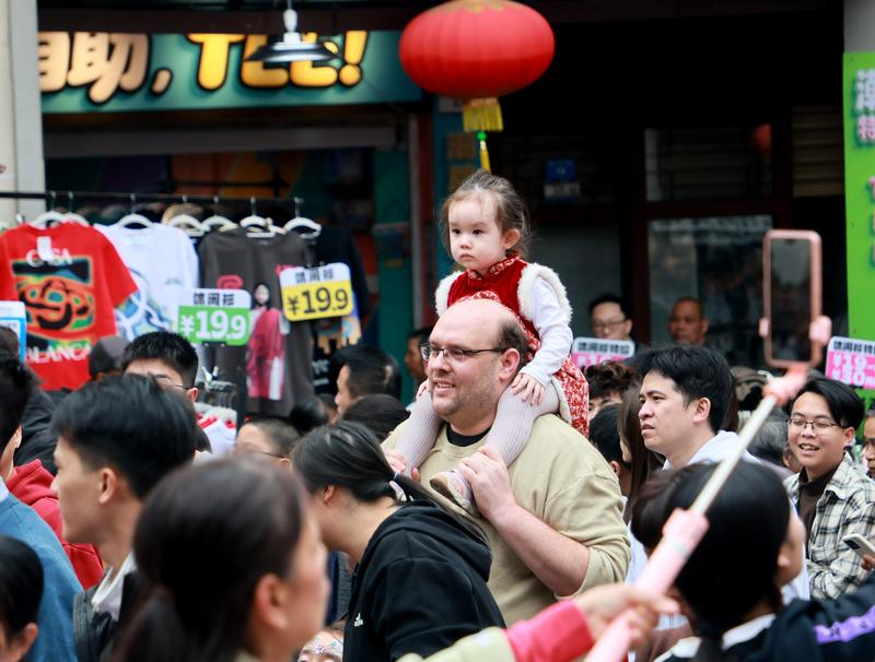 2026年2月17日,外国游客在广东肇庆宋城骑楼街观赏龙狮巡游。 新华社发(刘春林摄)