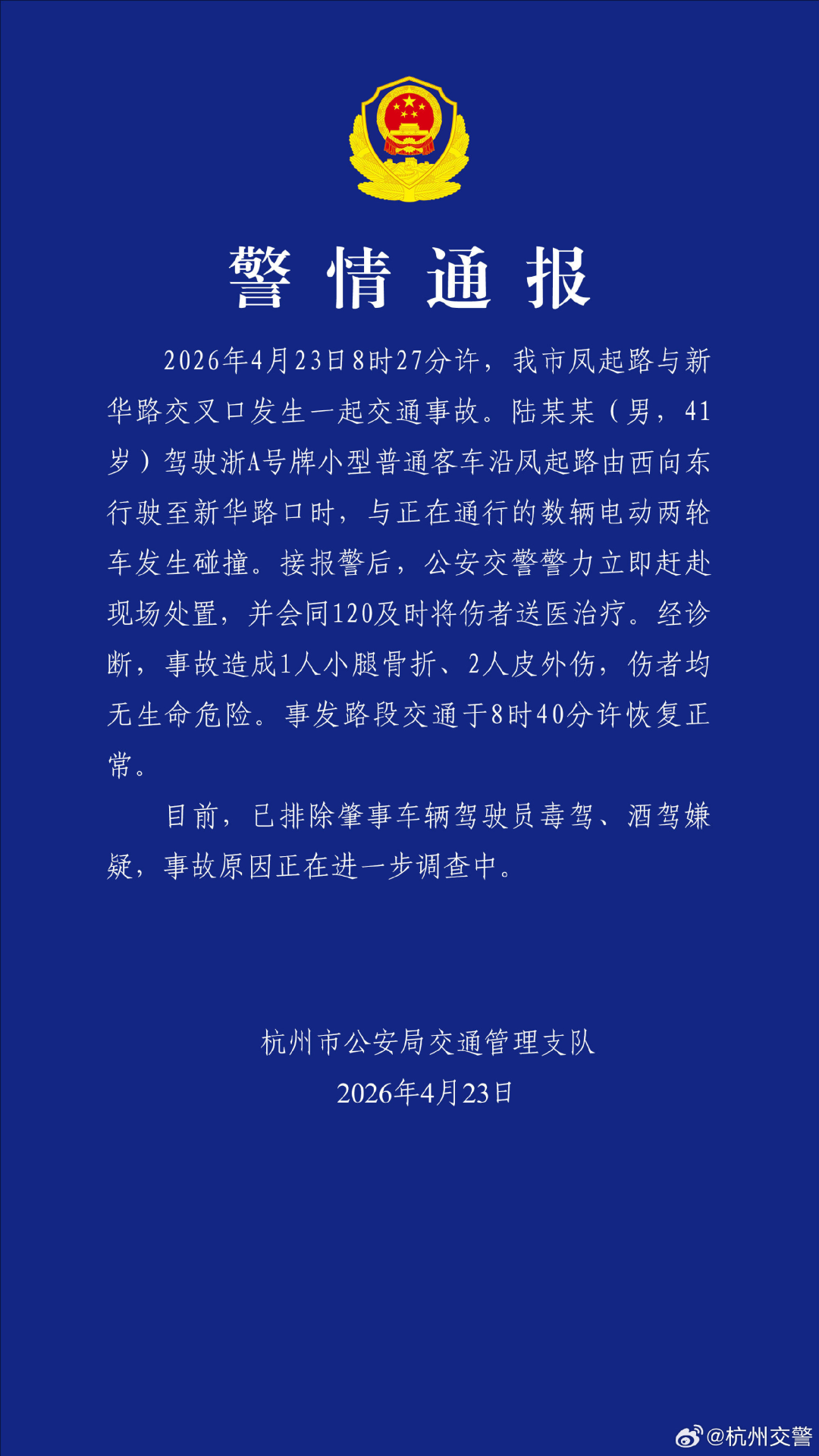 2026年4月23日8时27分许,杭州市凤起路与新华路交叉口发生一起交通事故。陆某某(男,41岁)驾驶浙A号牌小型普通客车沿风起路由西向东行驶至新华路口时,与正在通行的数辆电动两轮车发生碰撞。接报警后,公安交警警力立即赶赴现场处置,并会同120及时将伤者送医治疗。经诊断,事故造成1人小腿骨折、2人皮外伤,伤者均无生命危险。事发路段交通于8时40分许恢复正常。