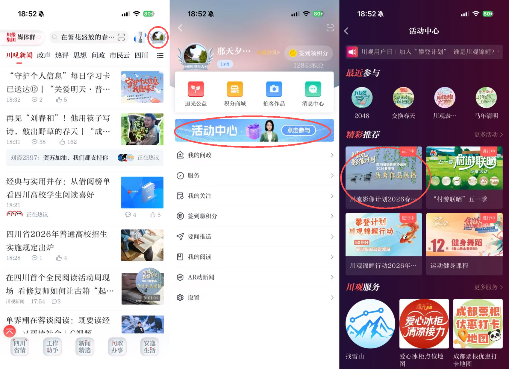 方式二:在川观新闻首页,点击右上角“我的”,点击“活动中心”,找到“春季赛展播”活动图片,点击即可参与;