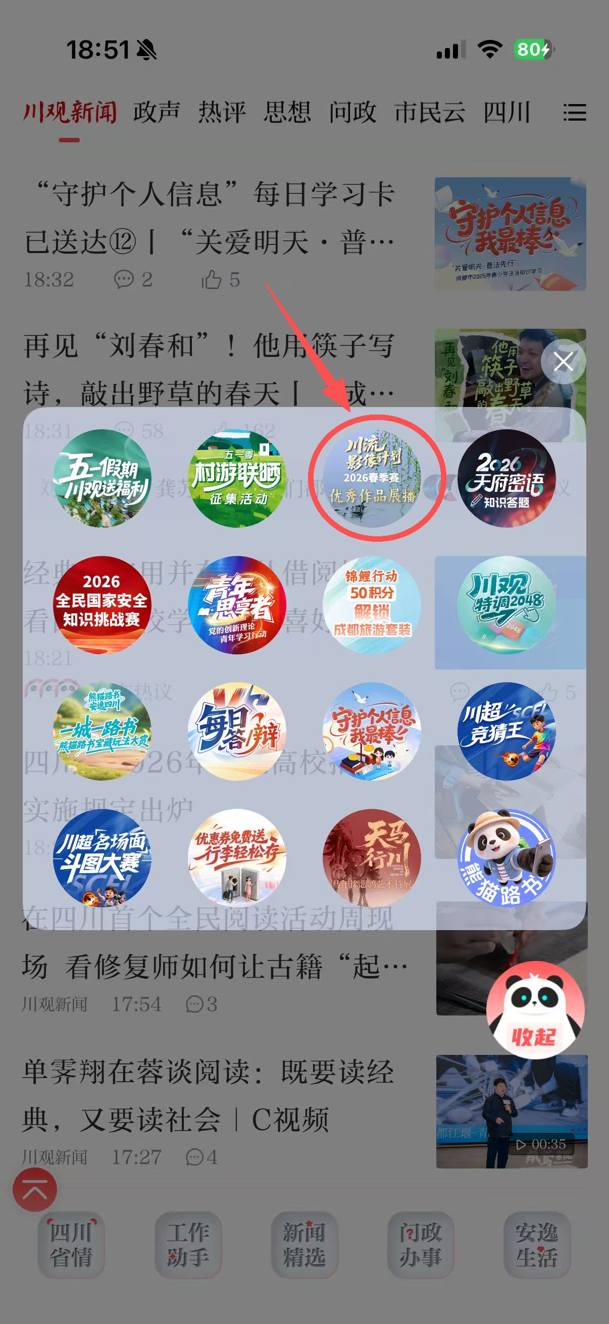 方式一:在川观新闻首页,点击右下方悬浮球,找到“春季赛展播”活动图片,点击即可参与;