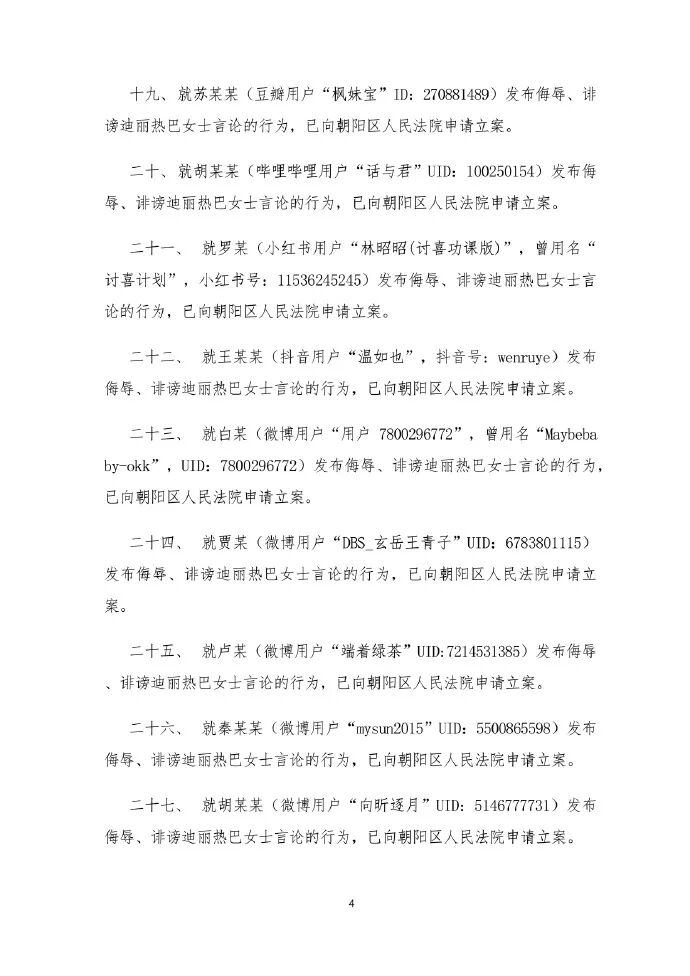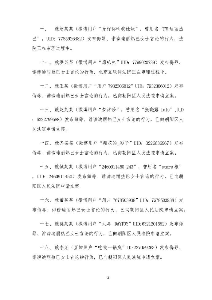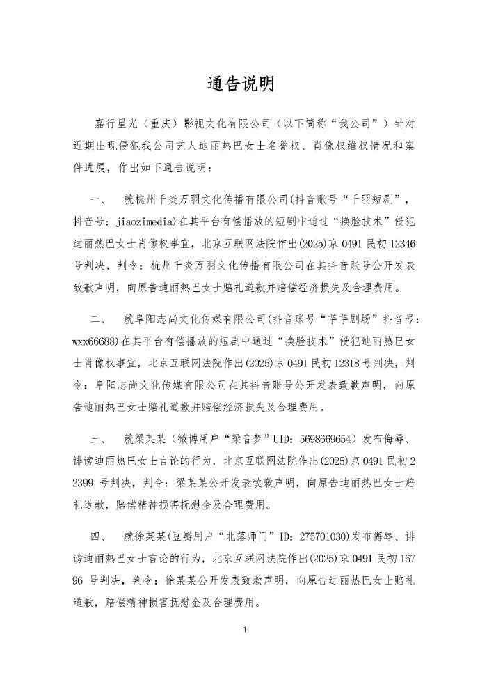 针对近期网络用户发布和传播对迪丽热巴女士的侮辱、诽谤言论,以及利用AI换脸技术侵犯其肖像权等行为,我司高度重视,已委托律师启动诉讼程序,坚决维护迪丽热巴女士的合法权益。