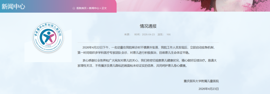 4月23日下午,重庆医科大学附属儿童医院发布情况通报,全文如下: