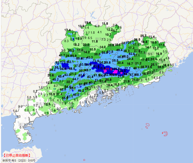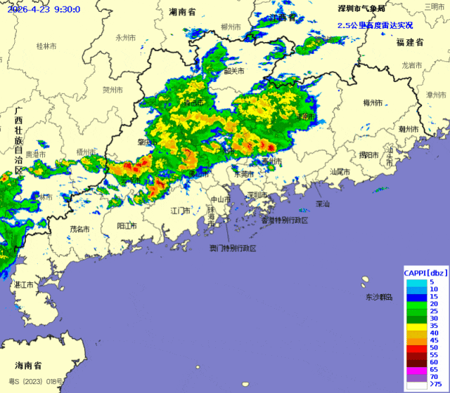 受高空槽、切变线及弱冷空气共同影响,今天(23日)一条大范围雨带盘踞广东上空,覆盖范围较广。我省中、西部,广州、惠州、清远、肇庆等多地出现了暴雨,我们的邻居惠州出现了大暴雨。深圳各区也都普遍出现了分散阵雨。