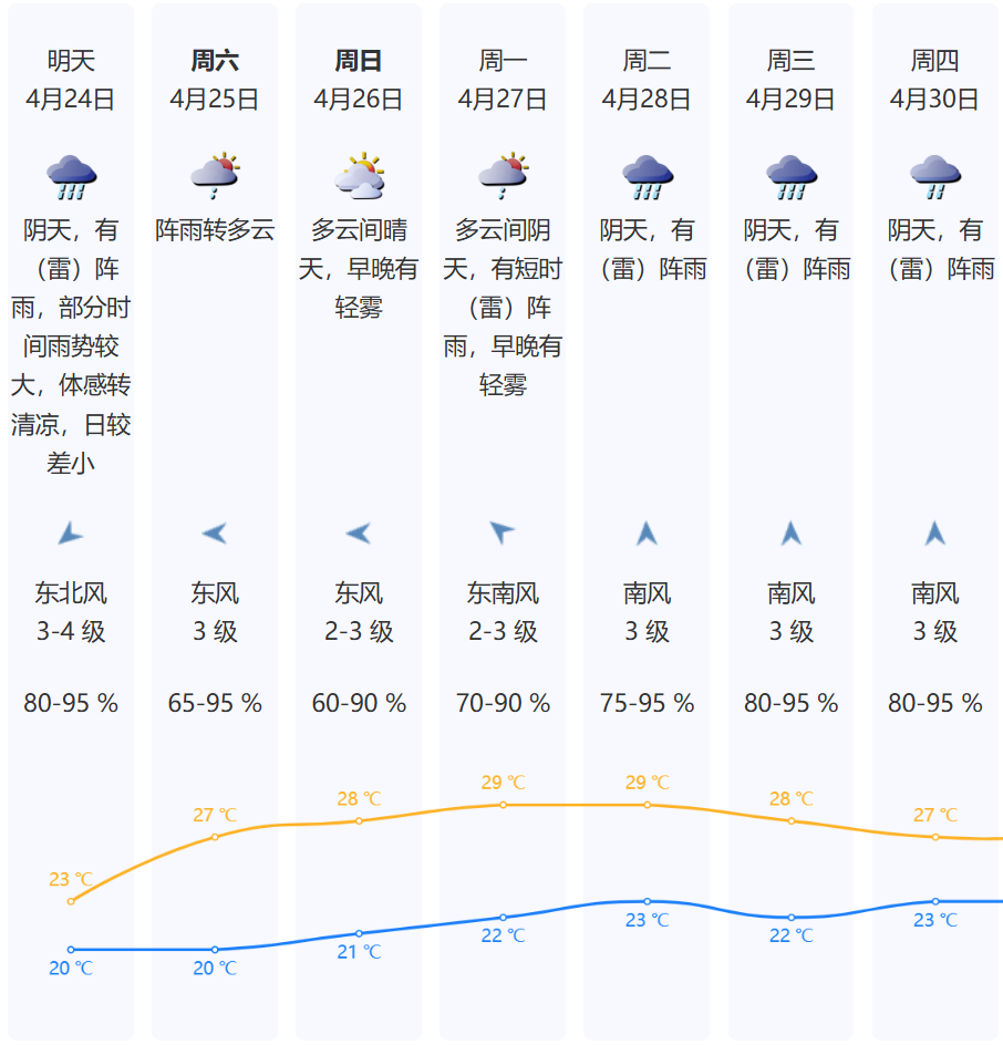 24日阴天有(雷)阵雨,局部可达暴雨,沿海、高地和海区最大阵风7级左右,日温差较小,白天气温在21℃左右徘徊,体感清凉;