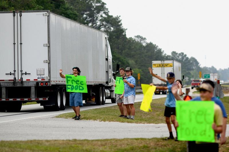 4月22日,在美国佐治亚州纳洪塔,人们举着标语示意可以为受灾民众提供免费食物。
