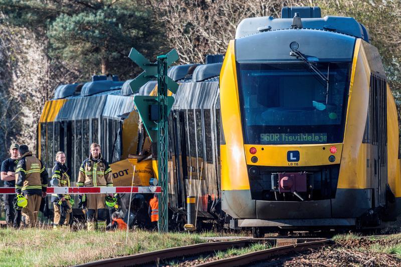4月23日,在丹麦首都哥本哈根北部,救援人员在火车相撞事故现场聚集。