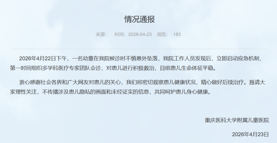 2026年4月22日下午,一名幼童在我院候诊时不慎意外坠落,我院工作人员发现后,立即启动应急机制,第一时间组织多学科医疗专家团队会诊,对患儿进行积极救治,目前患儿生命体征平稳。衷心感谢社会各界和广大网友对患儿的关心,我们将密切观察患儿健康状况,精心做好后续治疗。恳请大家理性关注,不传播涉及患儿隐私的画面和未经证实的信息,共同呵护患儿身心健康。