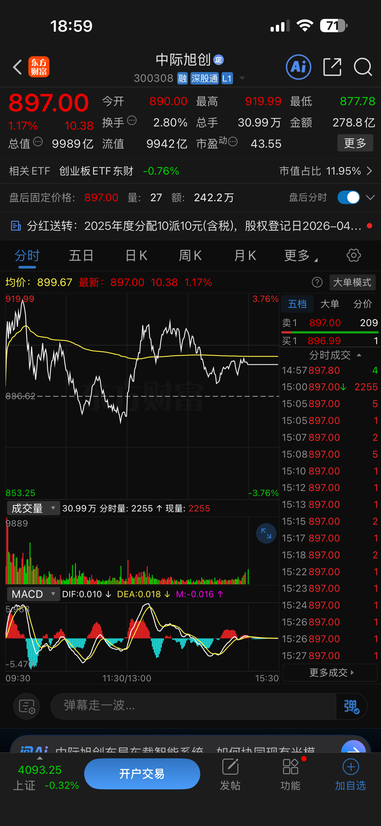 截至4月23日收盘,中际旭创报收897元/股,市值达9989亿元。