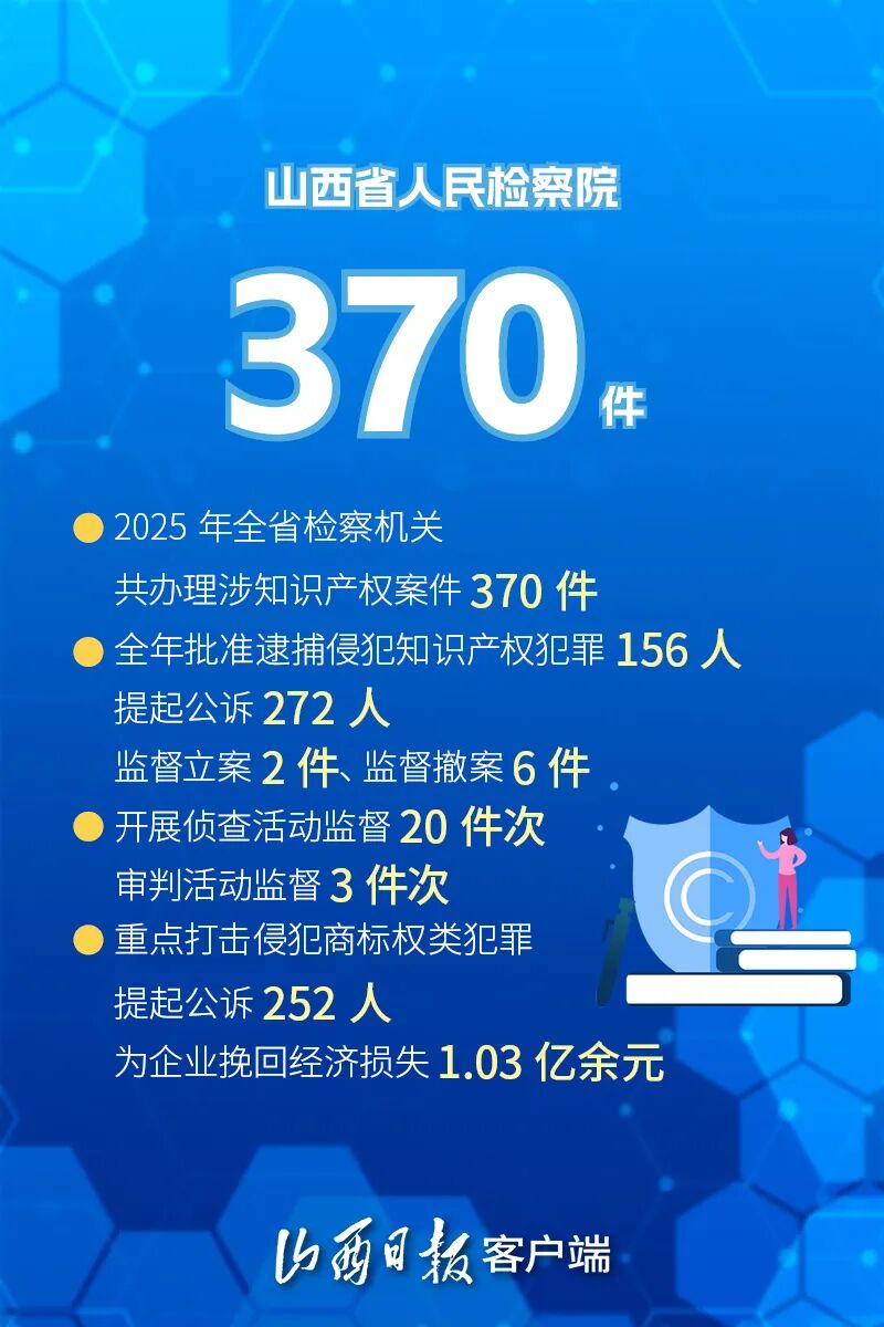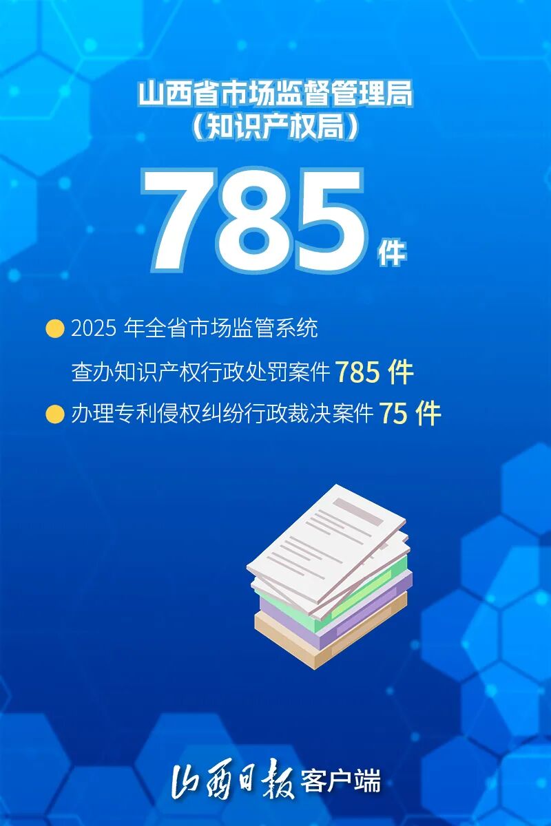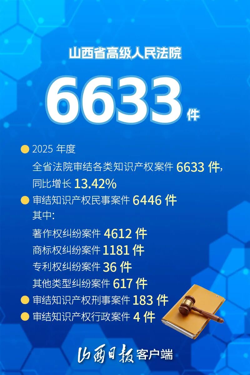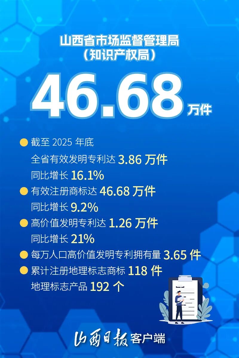 2026年4月26日是第26个世界知识产权日。2025年,山西知识产权工作交出了一份扎实的答卷:截至2025年底,全省有效发明专利达3.86万件,同比增长16.1%;有效注册商标达46.68万件,同比增长9.2%;盘活省内42所高校和科研机构存量专利1.3万件……一组组数据,见证着三晋大地创新活力的持续迸发。