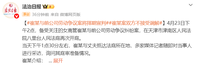 据@法治日报 消息,4月23日下午2点,备受关注的女高管崔某与前公司劳动争议纠纷案,在天津市津南区人民法院八里台人民法庭再次开庭。