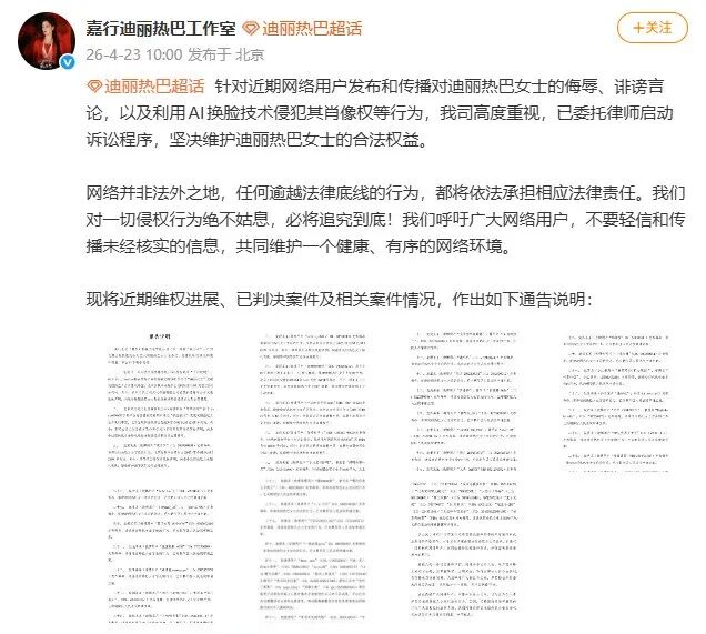 4月23日,嘉行迪丽热巴工作室官方微博发布声明,针对网络上对知名女演员迪丽热巴的侮辱诽谤、AI换脸侵犯肖像权等侵权行为,公布最新法律进展,已判决、审理中及申请立案案件共计40起。此外,有数十名用户个人信息正等待平台或法院披露。