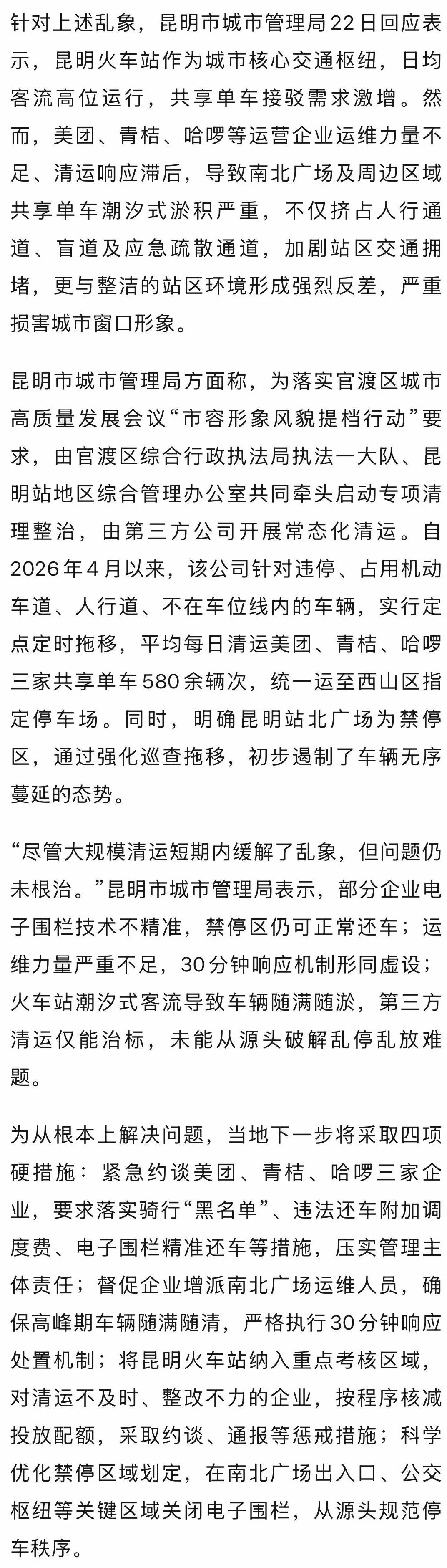 昆明市城市管理局4月22日回应称,部分企业电子围栏技术不精准,禁停区仍可正常还车,运维力量严重不足,30分钟响应机制形同虚设,将紧急约谈美团、青桔、哈啰三家企业,要求落实骑行“黑名单”、违法还车附加调度费等。