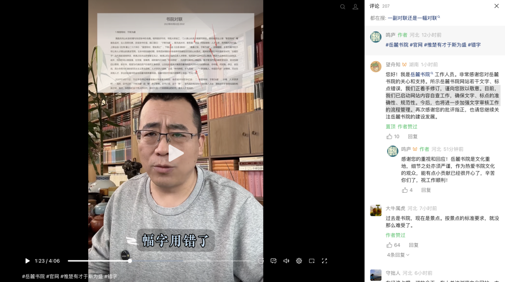 澎湃新闻注意到,在视频评论区,一名自称是岳麓书院的工作人员评论表示,他们正着手修订。目前,他们已启动网站内容自查工作,确保文字、标点的准确性、规范性。今后,也将进一步加强文字审核工作的流程管理。