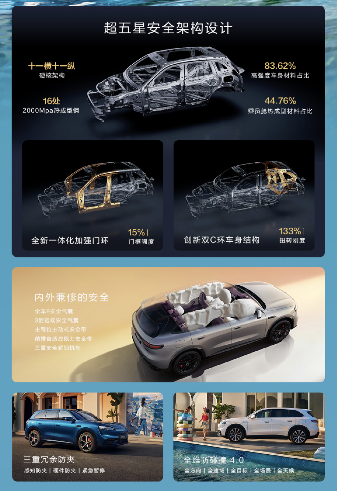 安全,是问界品牌始终坚守的底线。车身采用83.62%高强钢材料,热成型钢占比40.81%,A柱采用2000MPa热成型钢,笼式车身配合十一横十一纵结构,扭转刚度达到40502Nm/deg,并首次在国内应用半固态镁合金结构件(减重20%)。被动安全方面标配9气囊(含中央远端气囊),主动安全方面全系搭载全维防碰撞4.0,前向防碰撞最大生效范围4—150km/h。