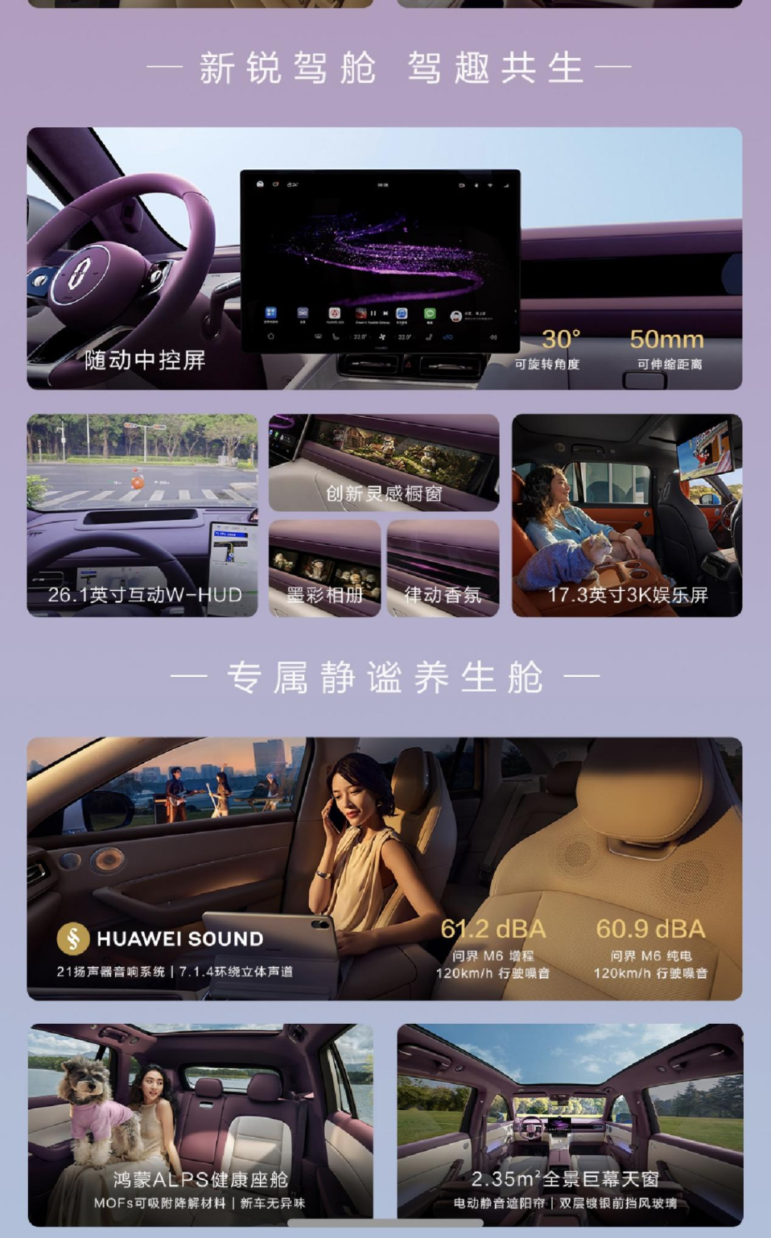 设计与智能座舱,同样体现着问界M6对年轻用户“情绪价值”的深度回应。车内配备可左右旋转、前后伸缩的随动屏,内置鸿蒙座舱5.0系统,支持多音区语音交互与手机-车机超级桌面无缝流转。26.1英寸W-HUD抬头显示将导航、车速等关键信息直投前挡,后排可选17.3英寸娱乐屏,搭配21扬声器7.1.4声道音