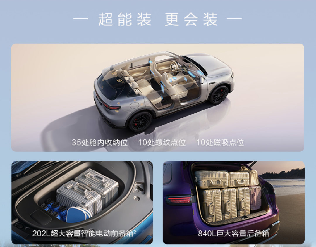 空间,是SUV用户的刚需。问界M6车身尺寸4960×1985×1736mm,轴距2950mm,舱内纵向空间3279mm,纯电版后备箱容积882L,前备箱容积最高达202L,支持8种开合方式,全车共设48处储物空间。纯电版前备箱标配三重防夹功能,后备箱还配备10个专用螺纹接口用于拓展露营装备。这样的空间表现,轻松满足年轻家庭用户多元化的装载需求。
