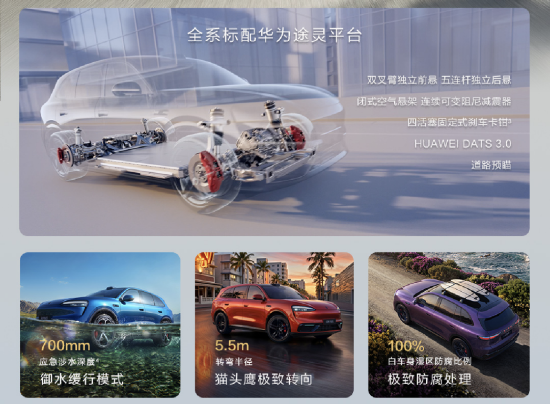 底盘,是衡量一台车机械素质的核心标尺,也是问界M6的另一张王牌。新车全系标配华为途灵平台,包含前双叉臂+后五连杆悬架结构、闭式单腔空气悬架和连续可变阻尼减震器,涉水深度达700mm。配合HUAWEI DATS 3.0动态自适应扭矩系统,可实现140km/h单轮爆胎不失控,在减少刹车俯仰及转弯侧倾的同时,兼顾了舒适性与驾控安全。把空气悬架作为全系标配下放到25万级车型上,这在同级别市场中尚属罕见。