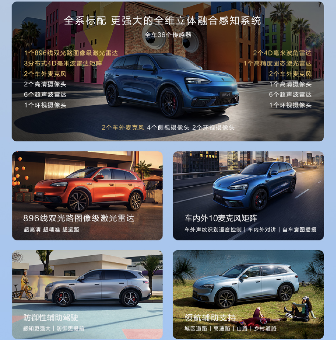 智驾,是问界M6最具说服力的差异化优势。新车全系搭载华为乾崑智驾ADS4.1高阶版系统,配备全球量产最高规格的896线双光路图像级激光雷达,配合前向+后向固态雷达、4D毫米波雷达等共计30个高精度感知硬件,可实现百米外动态细节识别。其中,896线双光路图像级激光雷达的稳定识别距离达到120米,对黑色轮胎、深色路障、异型障碍物的识别能力远超同级产品。更重要的是,城市NCA、高速NOA、泊车辅助等核心功能做到了全系标配,消费者无需再为这些功能单独买单——这正是“智驾平权”的真正含义。