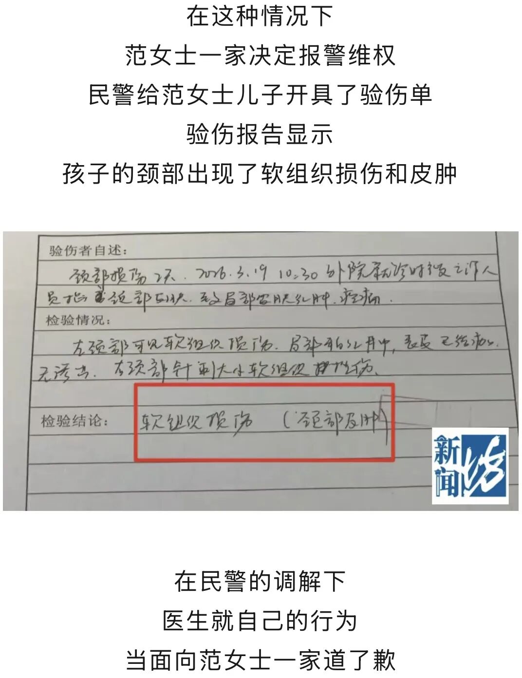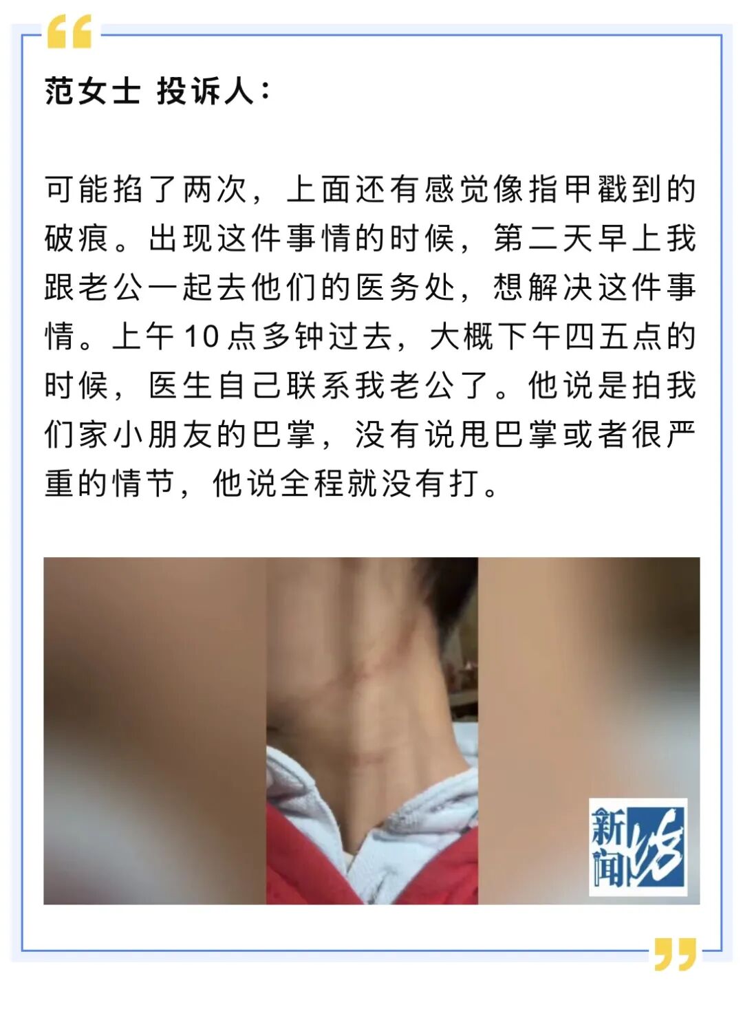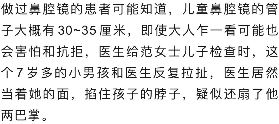 医生就一直在催我,说你们快点,他说你要看吗,不看,你们就走,我不给你们看。我儿子有点害怕,然后医生就忽然不知道为什么一下子情绪上来,直接掐住我儿子的脖子,右手拿鼻腔镜的探测针,这个手压着,啪啪两下,这是我亲眼看到的,旁边还有一个护士也看到了。