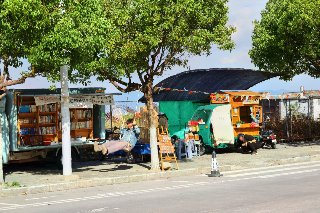记者在大理的阳光下,看见两个摊位,一个卖书,一个卖煎饼果子,他们相熟多年,彼此照亮,互相治愈。