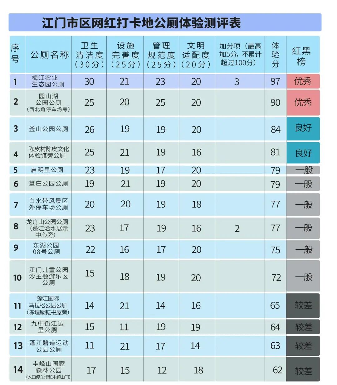 在14间公厕中,蓬江国际马拉松公园公厕(陈垣励耘书屋旁)和蓬江碧道运动公园公厕因卫生不达标、设施破损等情况被测评为“较差”,被纳入黑榜。4月23日,蓬江区农业农村和水利局回应称,该局已第一时间组织核查并部署全面整改,整改分阶段推进,将在10个工作日内,完成整改验收,巩固整改成效,建立长效管护机制。