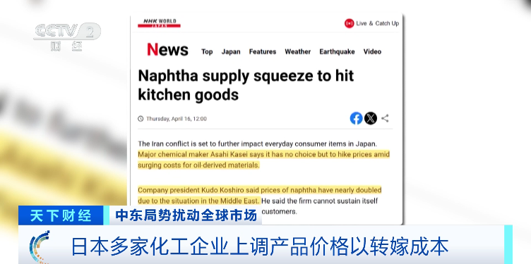 因此,企业端也在将成本压力逐步向消费端传导。日本大型化工企业旭化成近日表示,受中东局势影响,石脑油价格几乎翻倍,公司“别无选择”,只能上调产品价格。像保鲜膜这类日常用品,已经开始涨价。