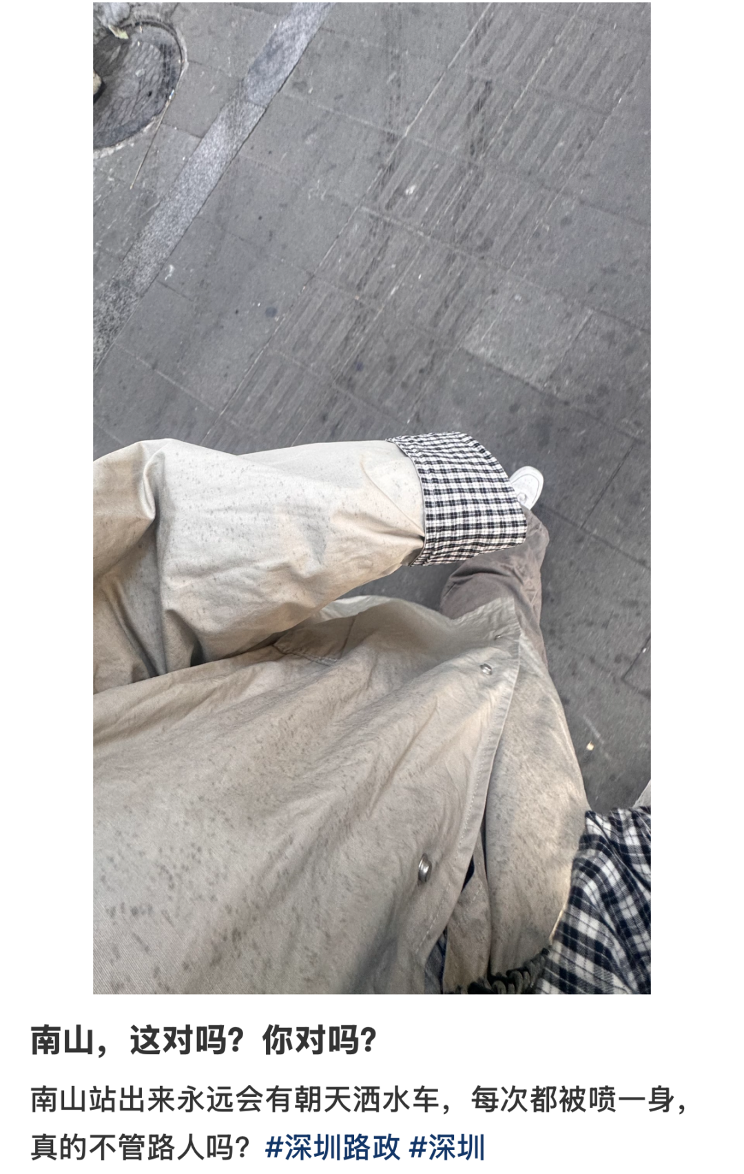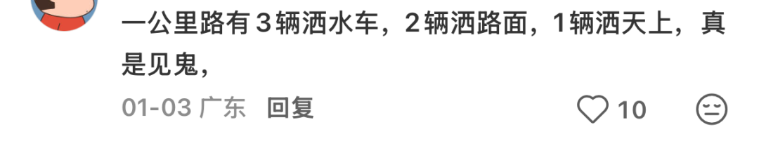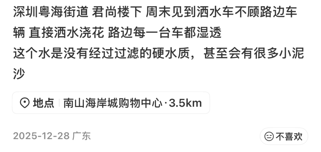 社交平台上,有市民时常被高空洒落的水雾淋湿衣物,“南山朝天洒水车,每次路过都被喷一身”。