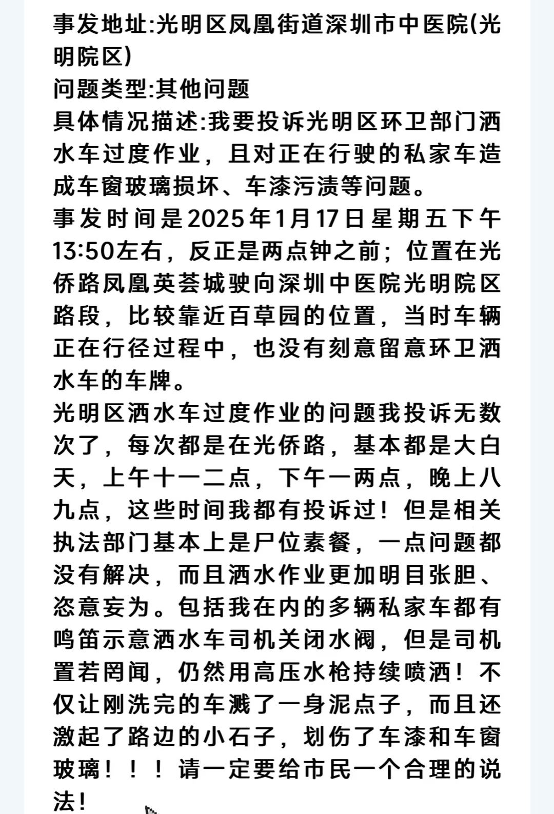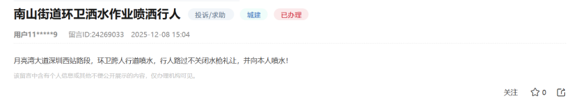 同年12月,有市民反映“月亮湾大道深圳西站路段,“环卫跨人行道喷水,行人路过不关闭水枪礼让,并向本人喷水”。