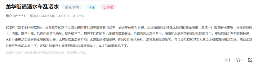 公共道路上,行人被强行喷洒的情况屡见不鲜。有市民通过人民网“领导留言板”反映,2025年12月1日,其骑电动车在龙华街道三联路行驶时,洒水车高压水柱直接往脸上、衣服、鞋子上喷,水柱冲击电动车导致车轮易打滑,视线受阻,极大威胁骑行安全。