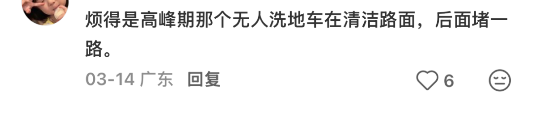 “高峰期无人洗地车在清洁路面,后面堵一路”“一公里路有3辆洒水车,2辆洒路面,1辆洒天上”。不少网友表示,城区主干道常有无人洗地车占道作业,行驶速度缓慢,直接压缩通行空间,导致后方车辆排长队拥堵,加剧高峰时段交通压力,影响通勤效率。