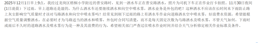 洒水车在雨后作业浪费资源,也遭到市民质疑。有网友通过深圳论坛反映,2025年12月1日,龙岗区梧桐小学附近普安路路段,洒水车在该片区降雨后仍开展洒水及空中喷雾作业。据观察,类似“雨后洒水”现象并非个例,并表示多次遇到降雨后路面未干时,洒水车仍按固定频次作业的情况,既浪费水资源,也造成公共资金的无效支出。
