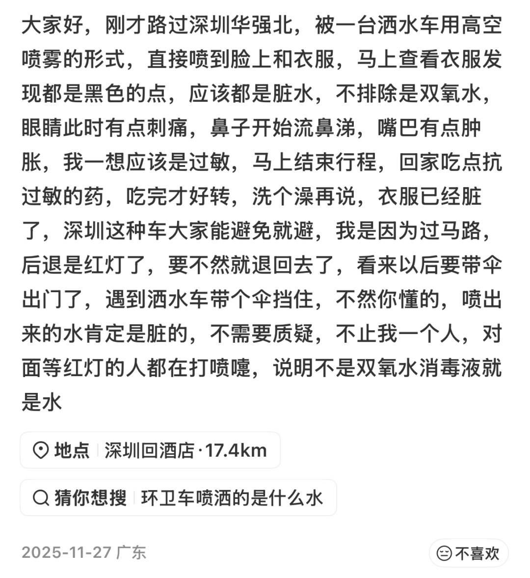 有市民在社交平台讲述了在华强北商圈的遭遇,途经此处遇到高空喷雾的洒水车作业,水雾直接喷洒在面部与衣物上。该市民发现,衣服表面附着大量黑色杂质斑点,皮肤后续出现发痒、泛红等轻微过敏症状。