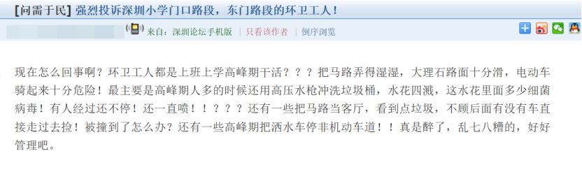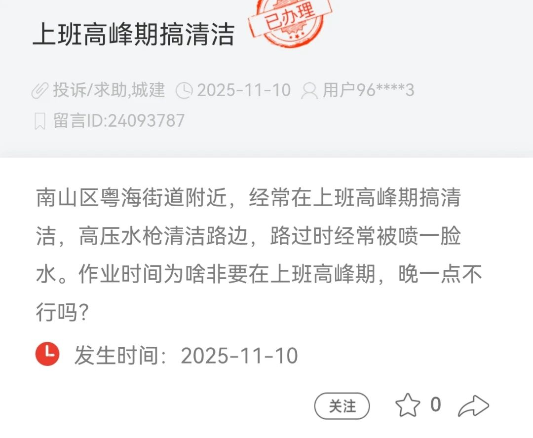 2025年11月,有市民通过人民网“领导留言板”反映,南山区粤海街道附近“经常在上班高峰期搞清洁,高压水枪清洁路边,路过时经常被喷一脸水”。