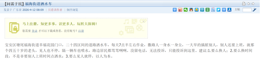 市民投诉南山区洒水车扰民