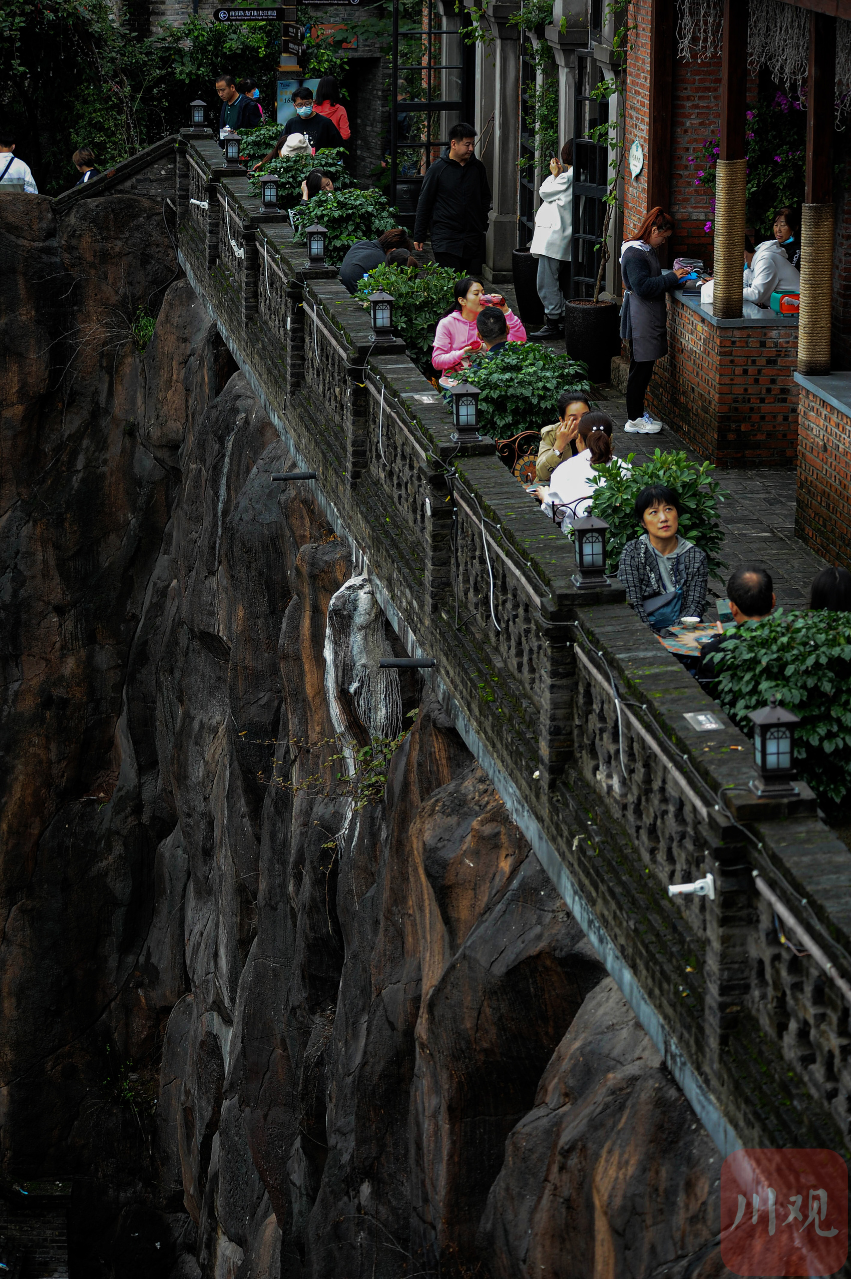 重庆南岸区的龙门浩老街,游客在崖边的餐厅区域用餐。